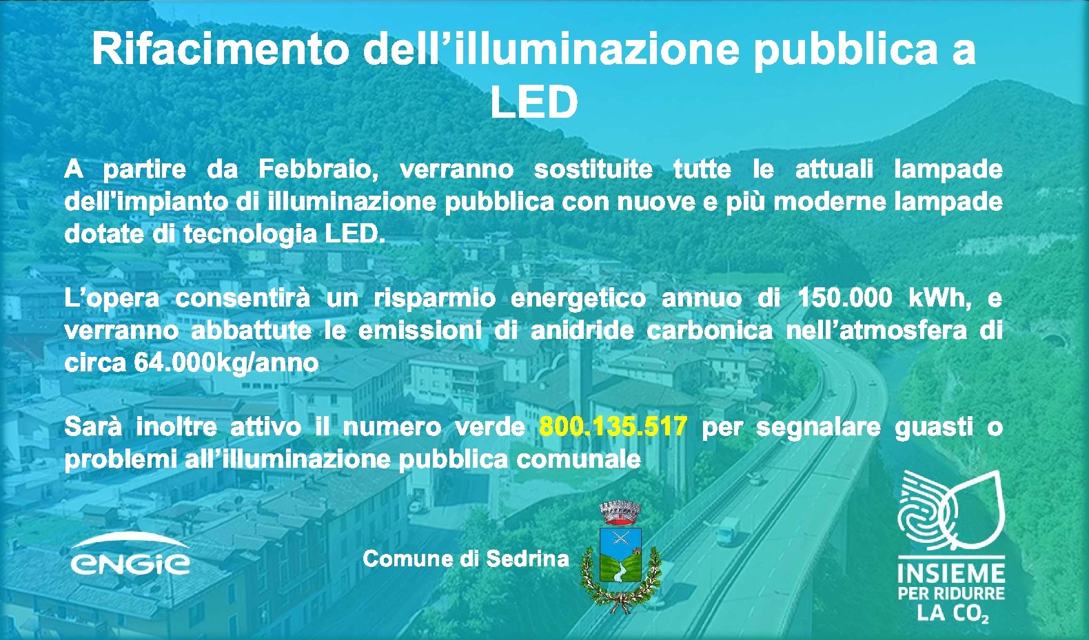 Si avvisa che a partire dal mese di febbraio 2021 avranno inizio i lavori di riqualificazione dell'impianto di pubblica illuminazione con nuove e più moderne lampade dotate di tecnologia a LED. Tale intervento rientra nel progetto FABER delle Provincia di Bergamo.