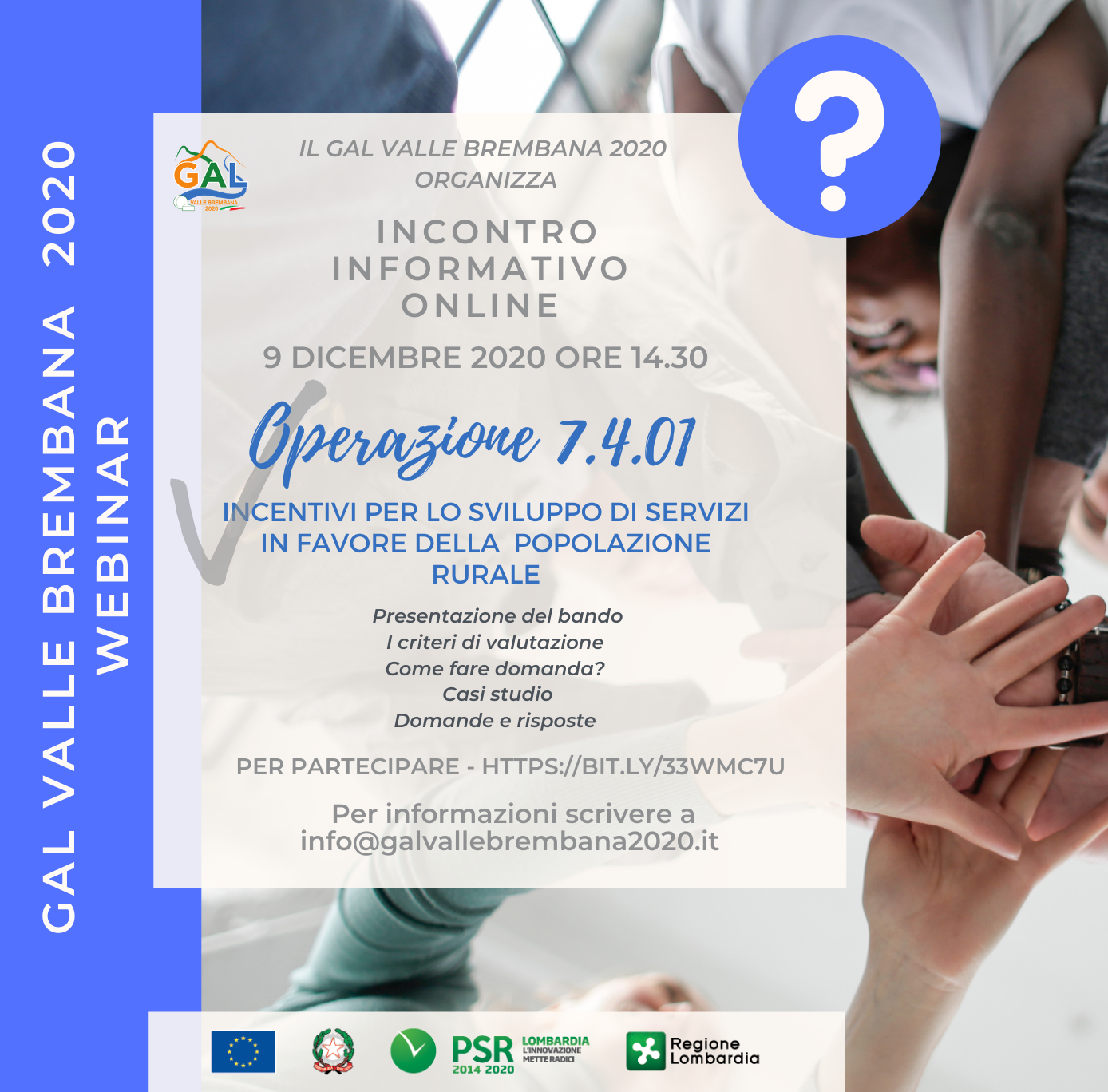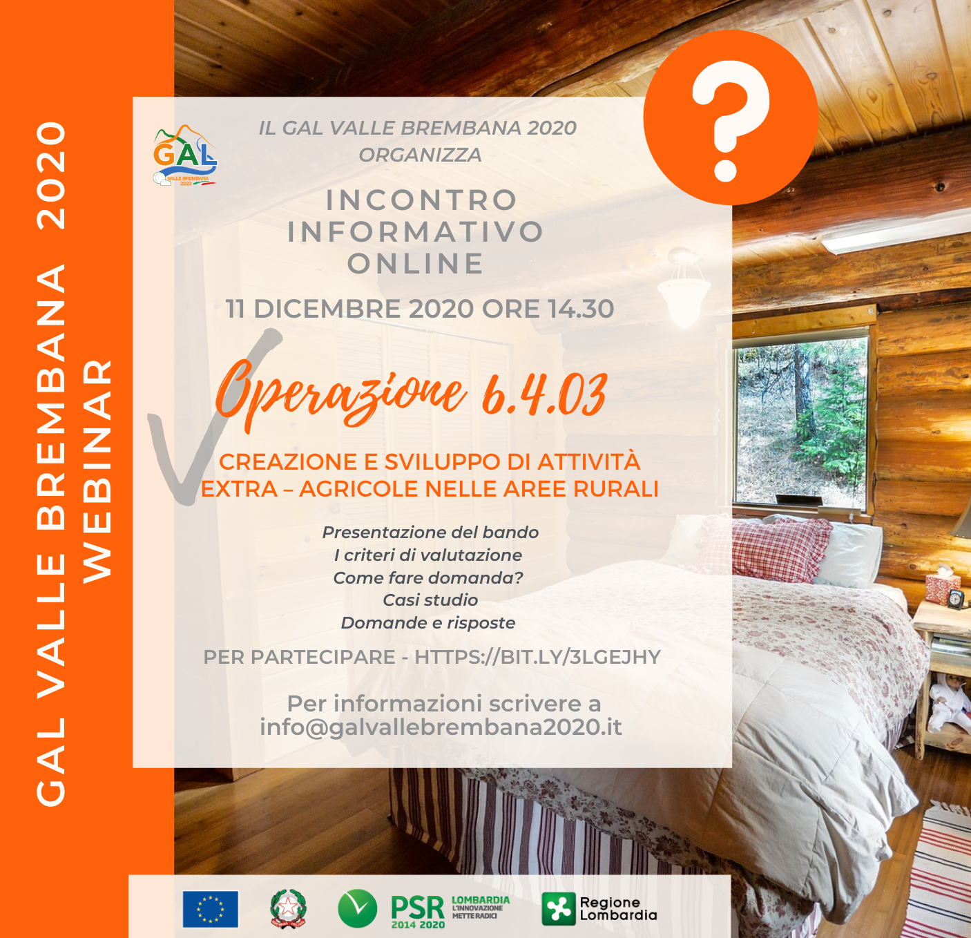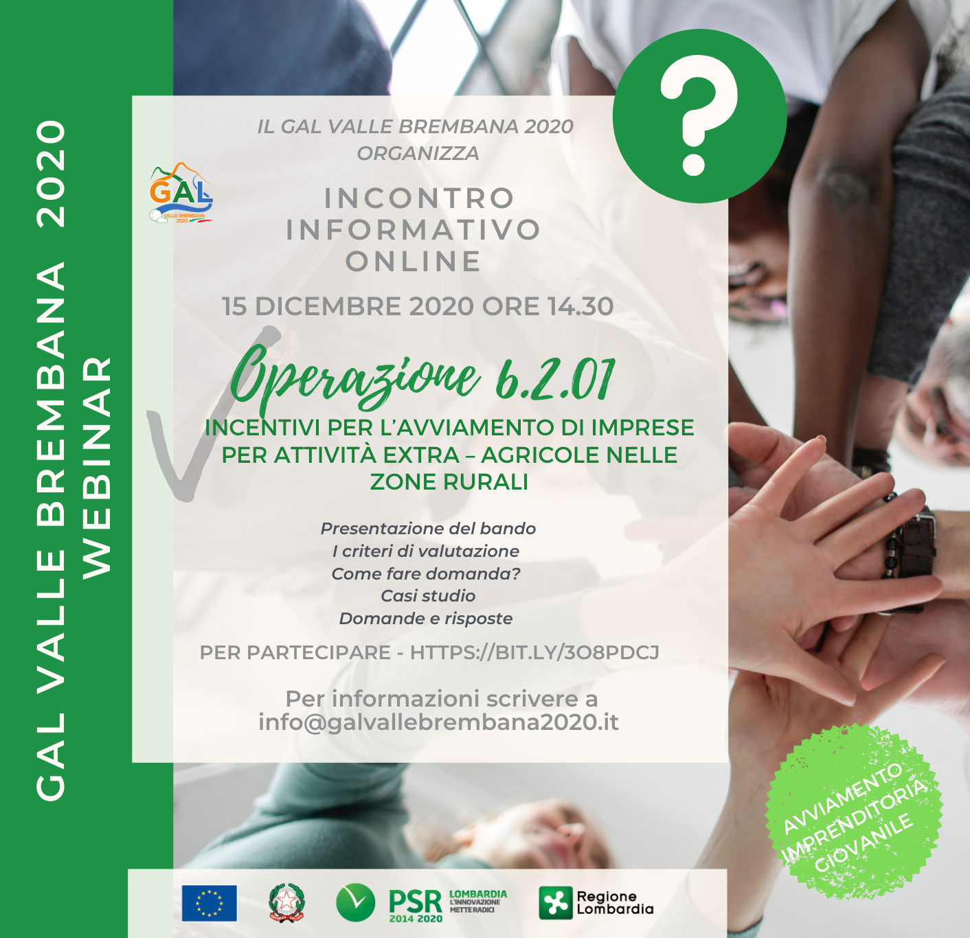 Il GAL Valle Brembana 2020 ha da poco indetto tre nuovi bandi che riguardano la possibilità di richiedere finanziamenti in ambito extra – agricolo. Per illustrarne il contenuto e le modalità di partecipazione, il GAL Valle Brembana ha organizzato tre incontri informativi online nei giorni 9, 11 e 15 dicembre alle ore 14.30 tramite la piattaforma Zoom. Si allegano le locandine dei rispettivi incontri, a cui possono partecipare tutti i soggetti interessati a presentare domanda di contributo.