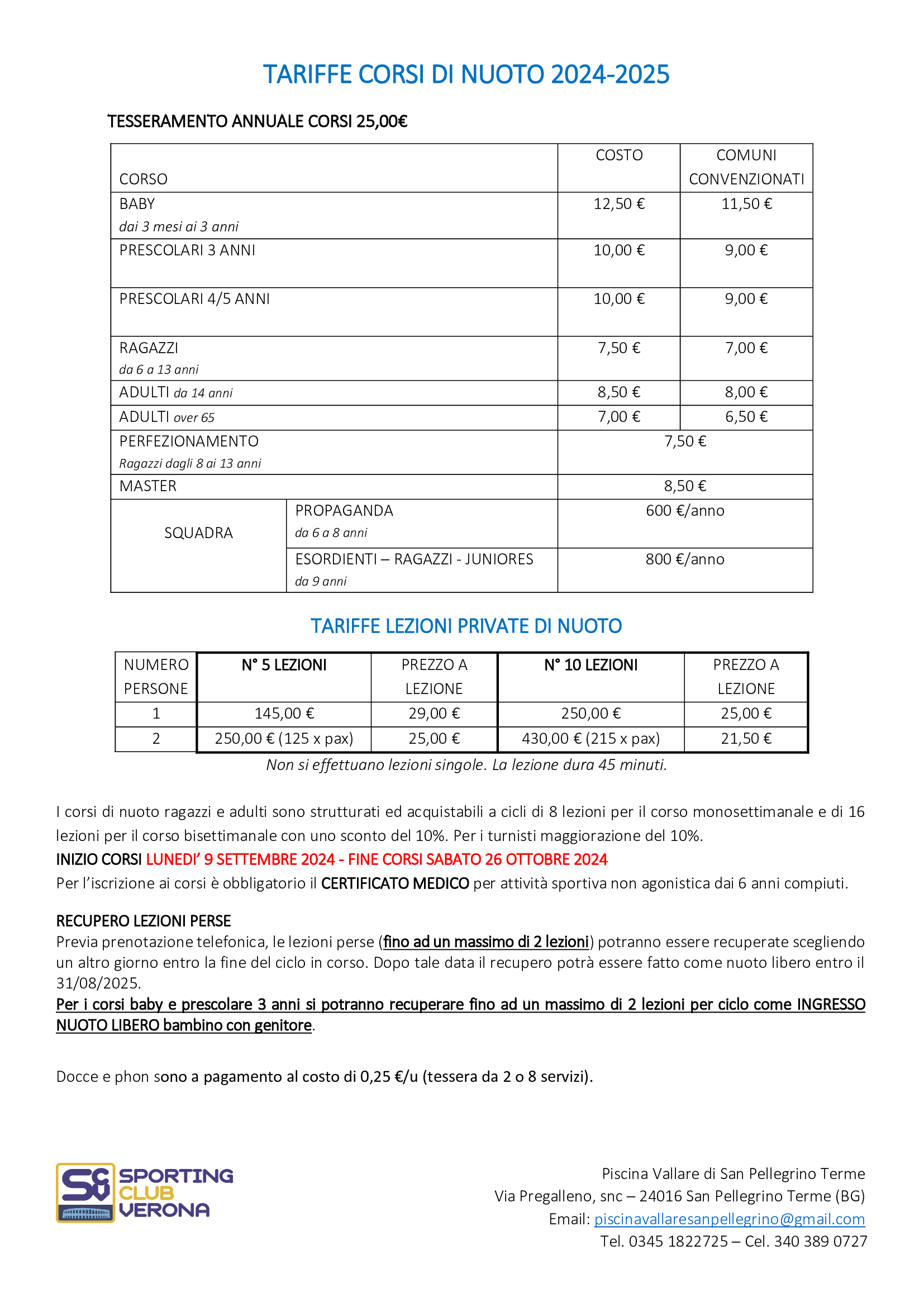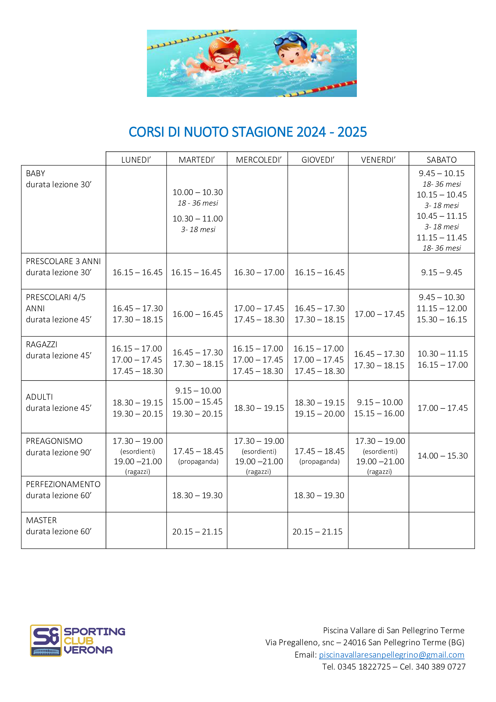 Dettagli della novità La piscina del Comune di San Pellegrino Terme comunica gli orari e le tariffe del corso di nuoto.