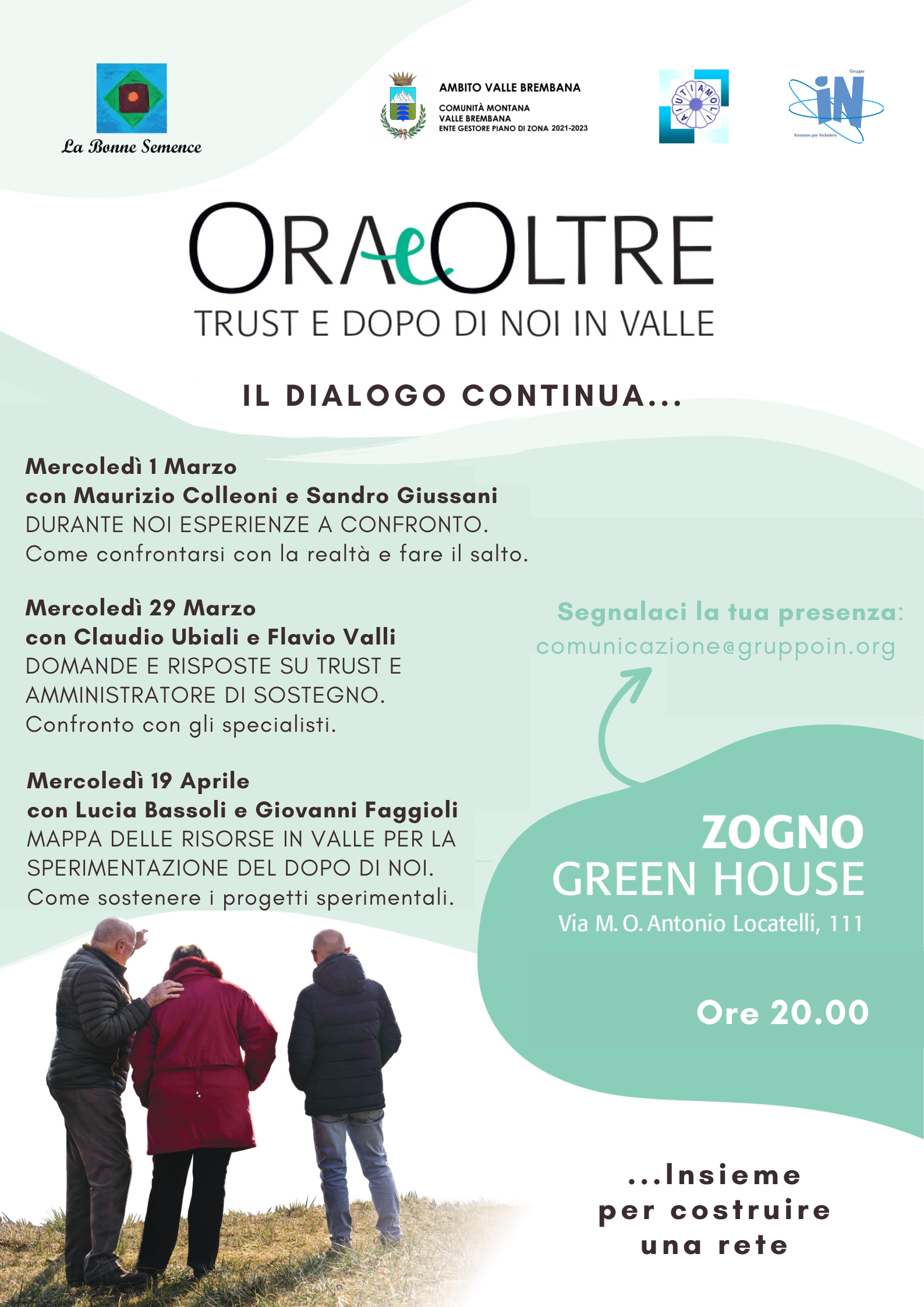 locandina relativa al ciclo di 3 incontri “Ora e Oltre – Trust e Dopo di noi in Valle” volti a dialogare insieme in merito a Trust, amministratore di sostegno e Progetto Dopo di Noi.