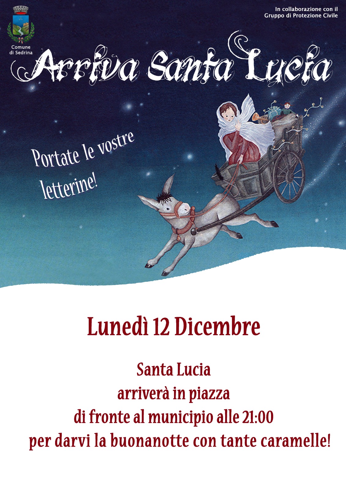 LUNEDI' 12 DICEMBRE SANTA LUCIA ARRIVERA' IN PIAZZA DI FRONTE AL MUNICIPIO ALLE ORE 21.00