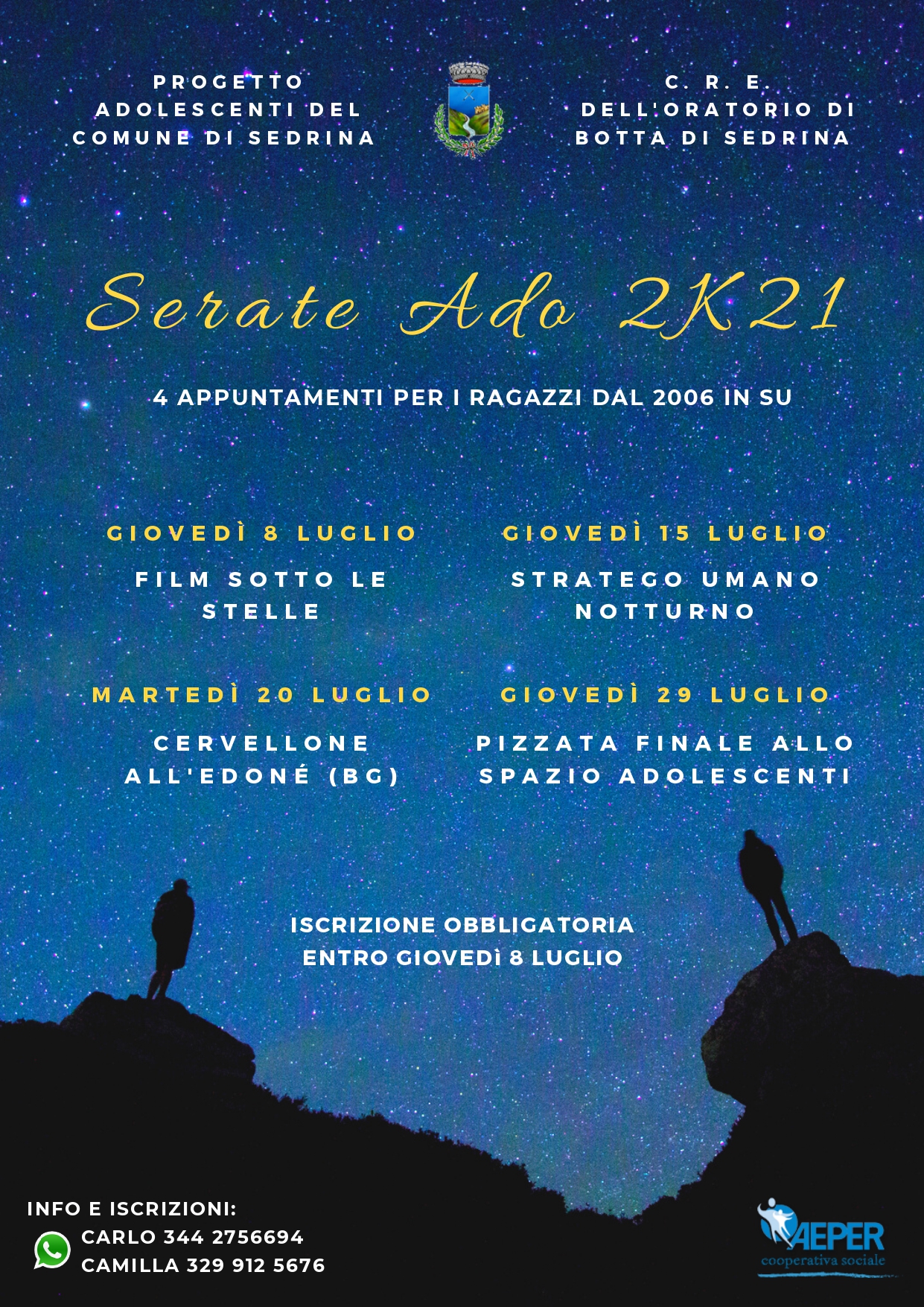 La cooperativa AEPER organizza n. 4 serate per adolescenti nati dal 2006. GIOVEDÌ 8 LUGLIO - Film sotto le stelle GIOVEDÌ 15 LUGLIO - Stratego umano notturno MARTEDÌ 20 LUGLIO - Cervellone all'Edonè (Bg) GIOVEDÌ 29 LUGLIO - Pizzata finale ISCRIZIONI OBBLIGATORIE ENTRO GIOVEDI' 8 LUGLIO